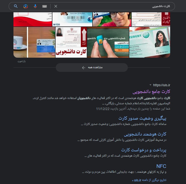 با جستجوی عبارت کارت دانشجویی رتبه اول در کشور و همجنین پنج لینک بعدی نیز در گوگل متعلق به سایت uis.ir میباشد که توسط انستیتو بردار سئو شده است، در قسمت پائین سایت میتوانید لینک ما را مشاهده فرمائید.